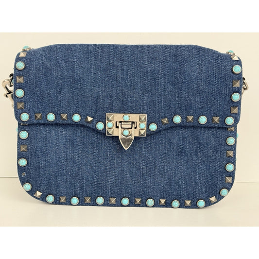 Valentino Rolling Rockstud Denim and Leather Shoulder Bag with Multicolor Strap