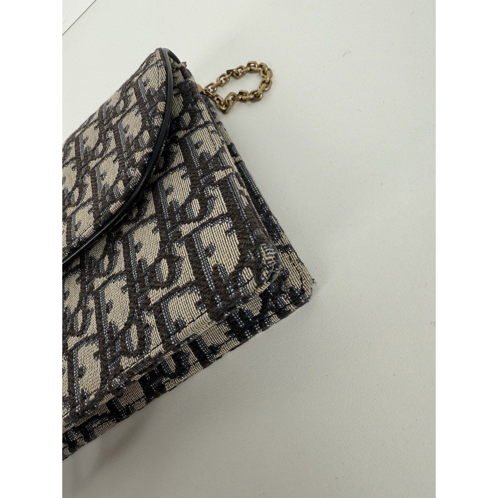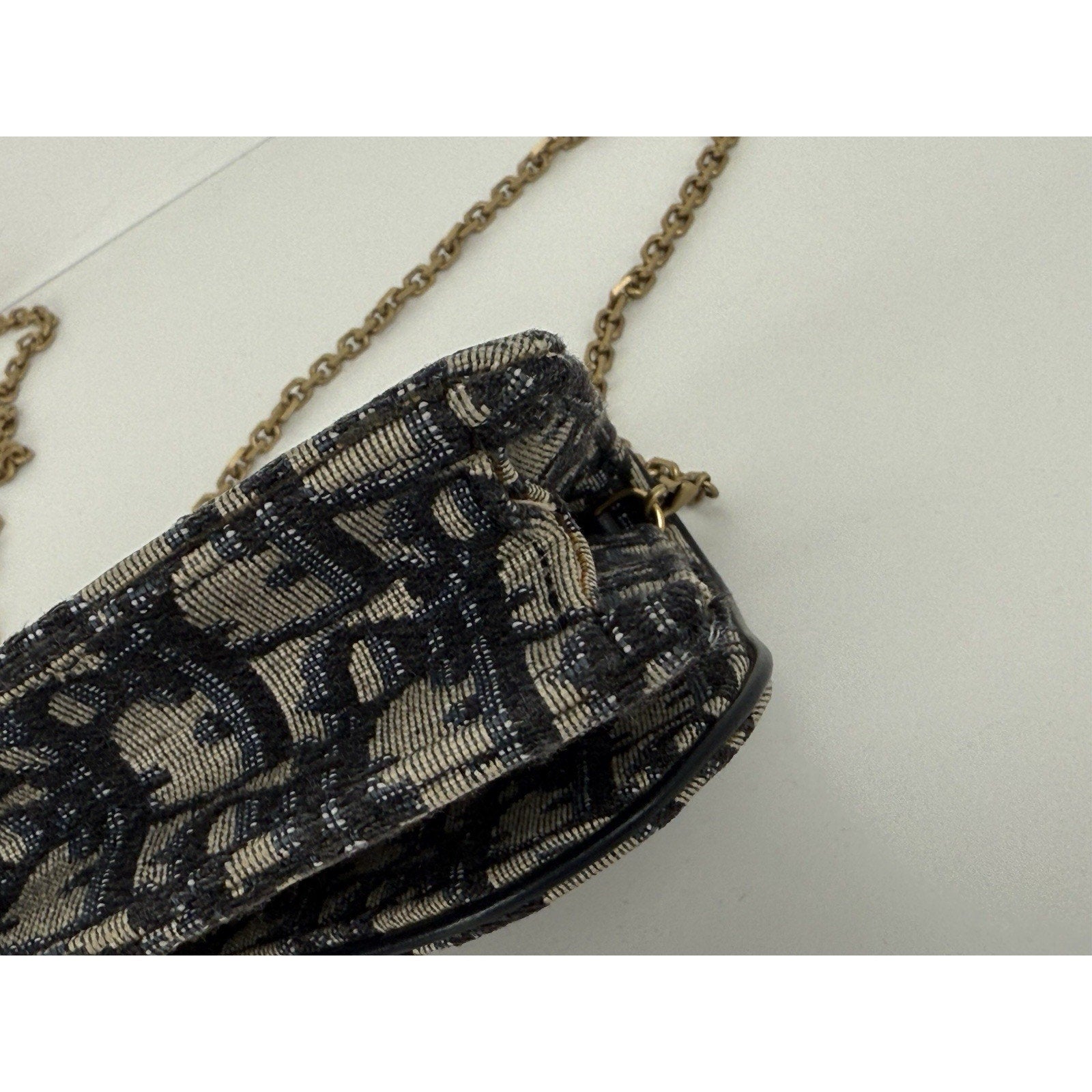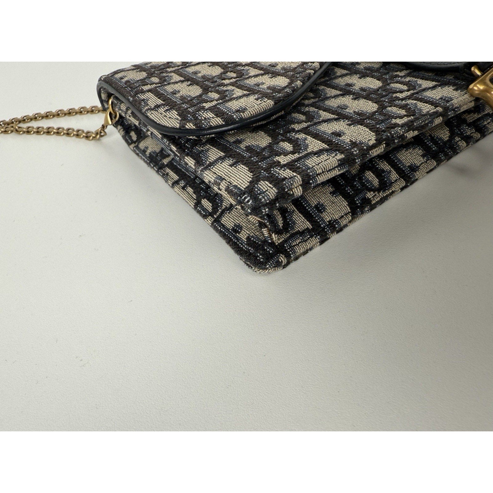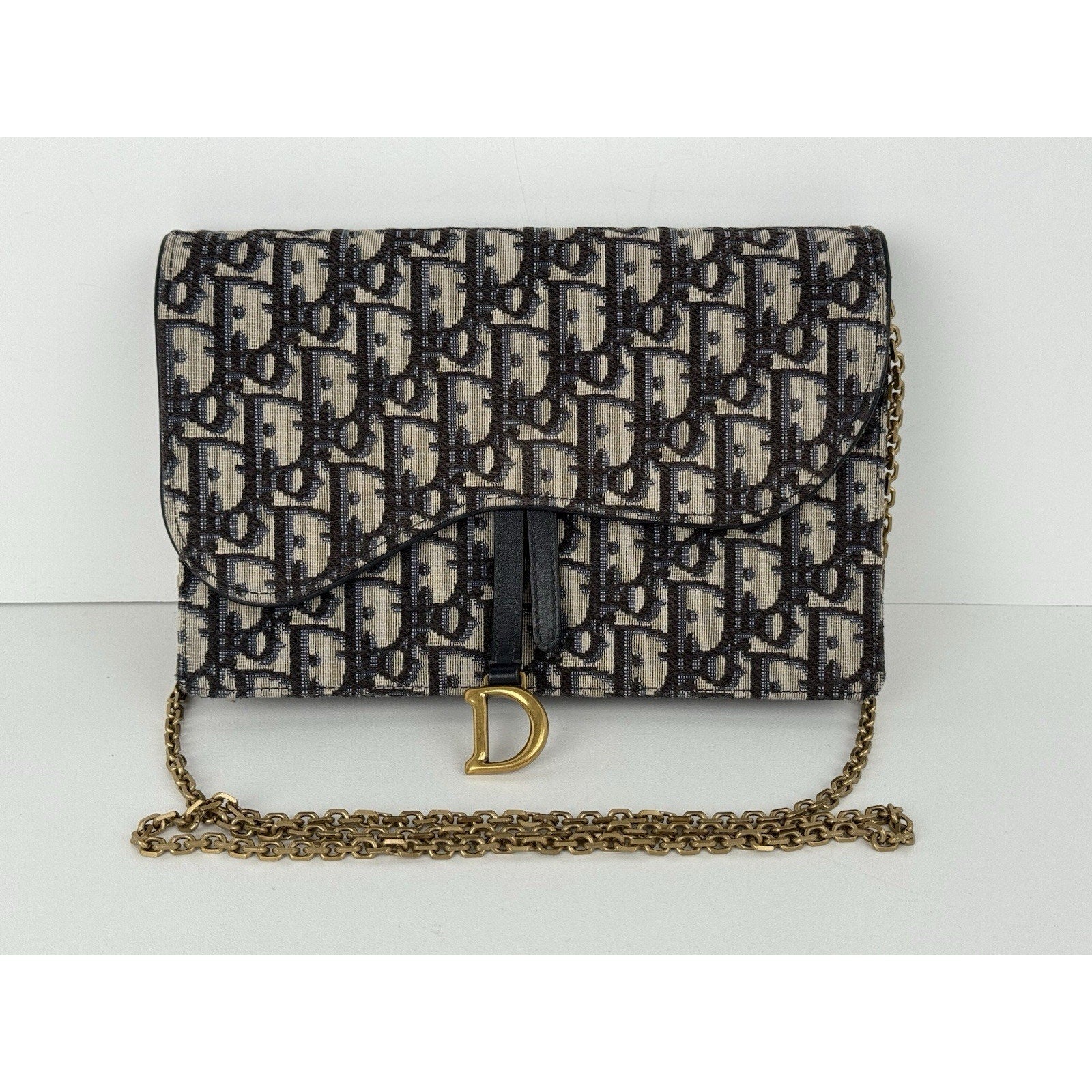 DIOR Blue Oblique Jacquard Medium Saddle Pouch with Chain – Canvas & Leather (Gently Used, Good Condition)