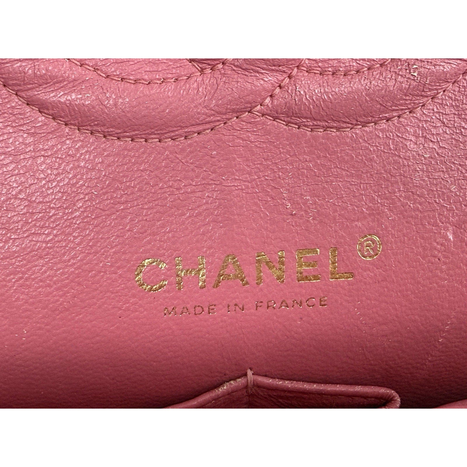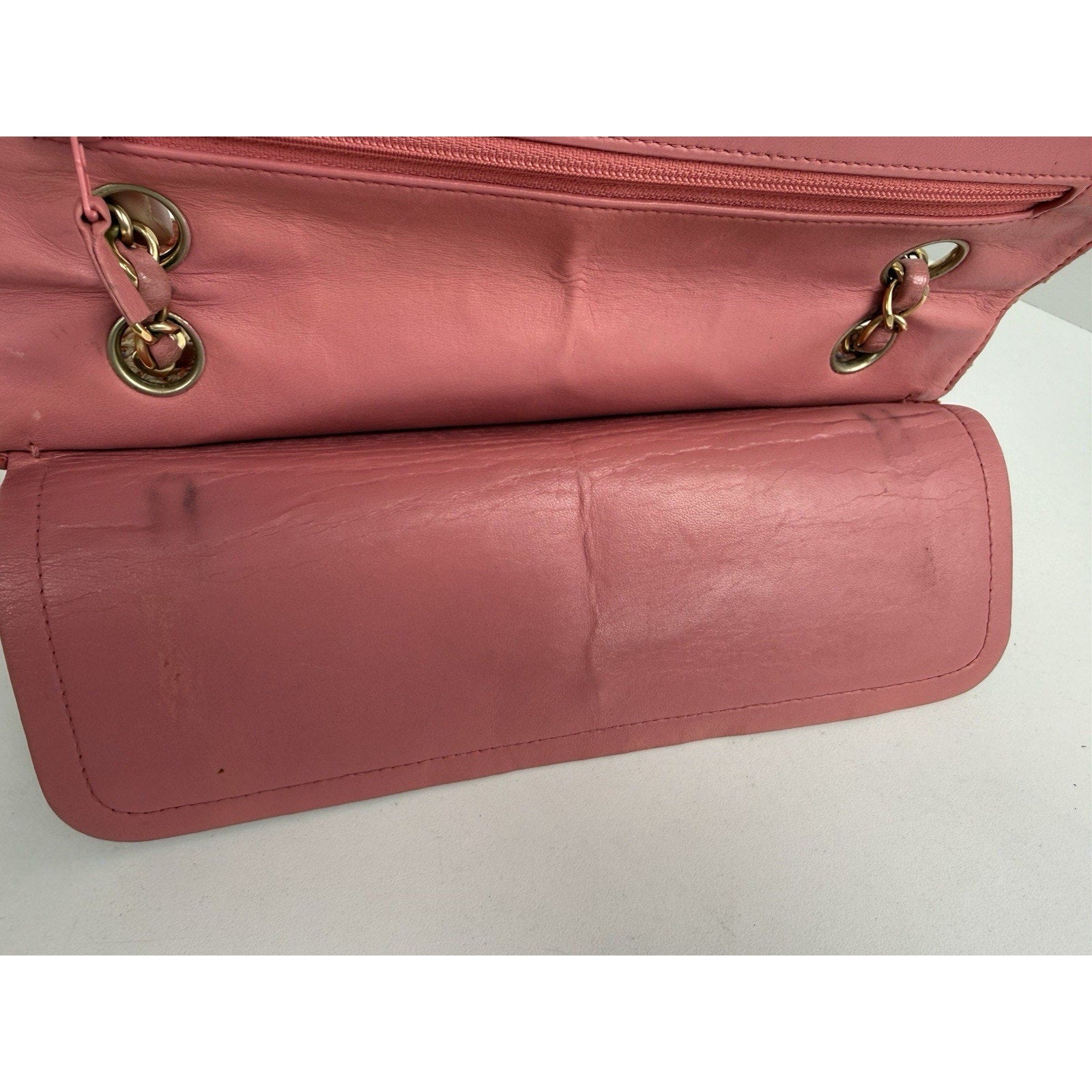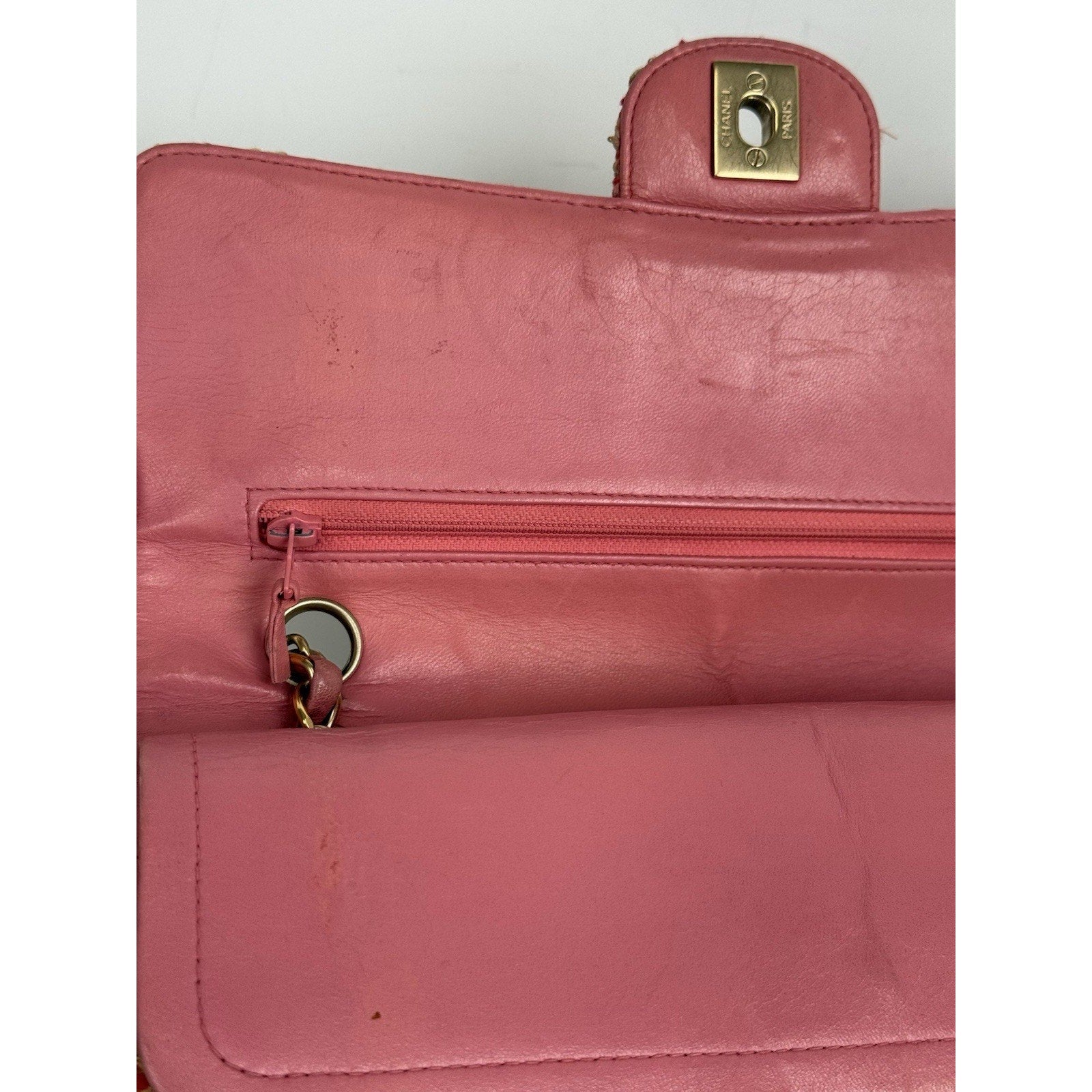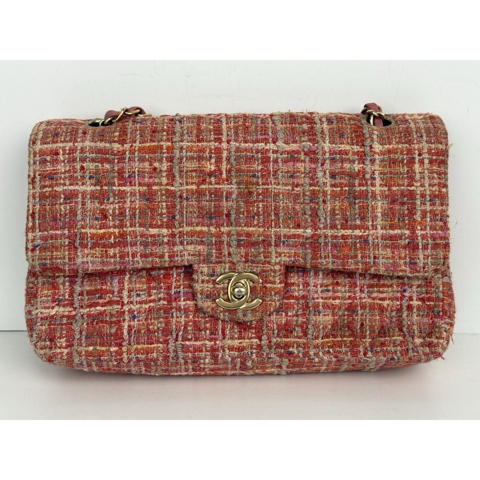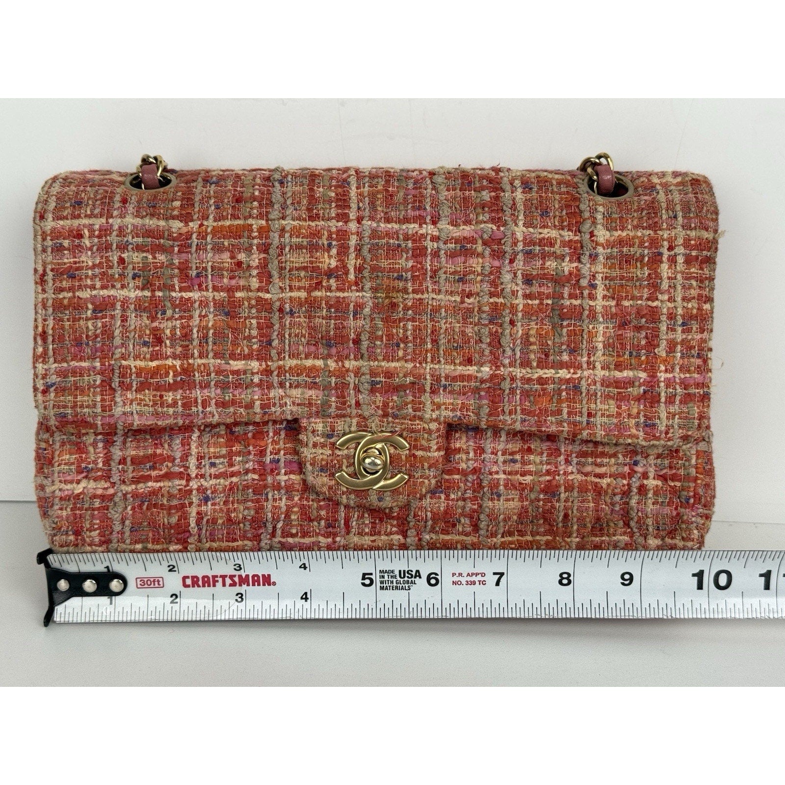 A timeless Chanel double flap with elegant pink tweed, offering a chic yet classic look. Though showing wear, it remains a highly sought-after piece.
