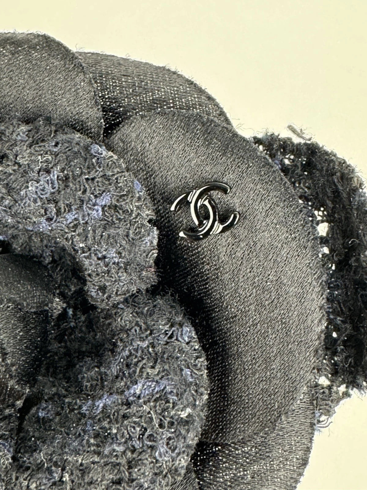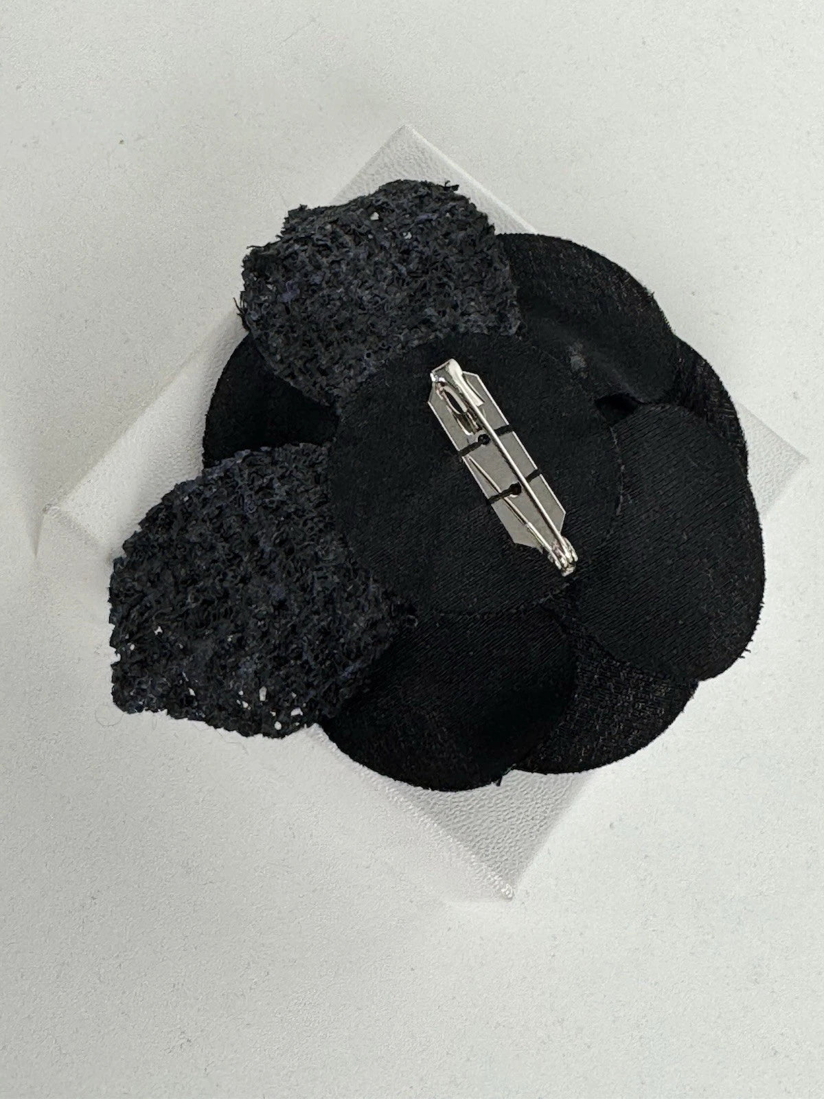 Condition: Like new — The brooch is in excellent condition, showing virtually no signs of wear. The fabric remains crisp and vibrant with elegant black and navy blue tones. Features a discreet Chanel logo and includes the original box for a refined presentation.