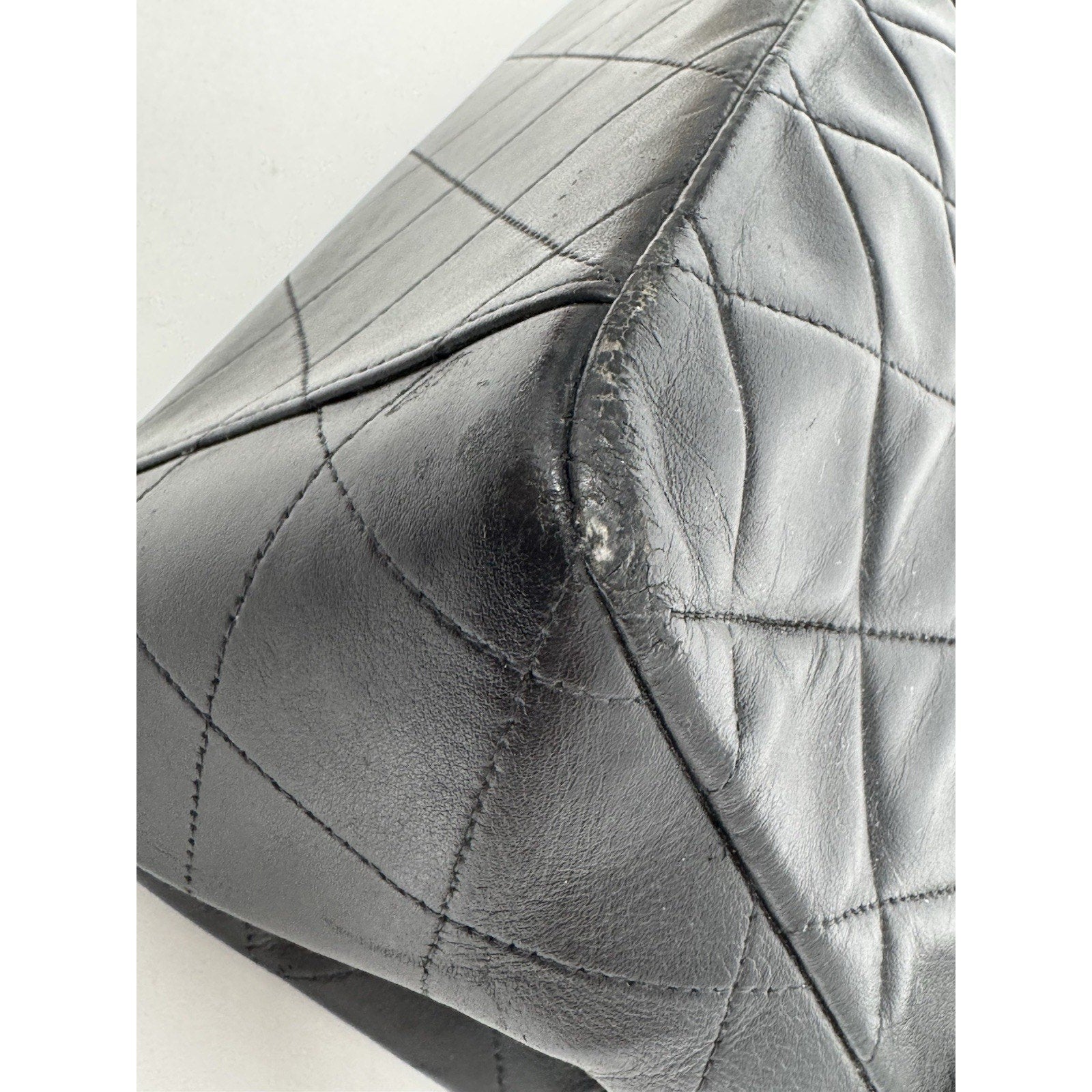 Exterior Condition: Black lambskin leather shows visible wrinkles and scuffs, especially around the edges. Barely visible stains are present, and the leather retains its vintage charm.