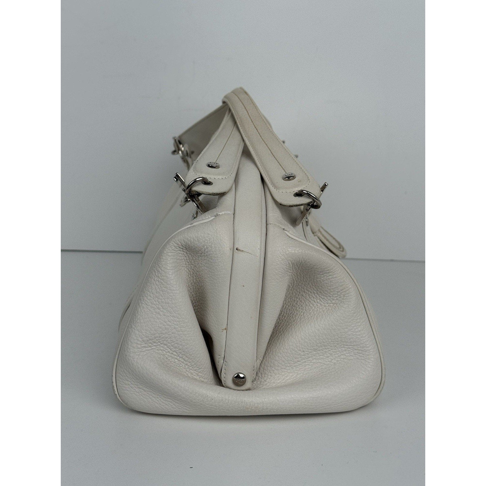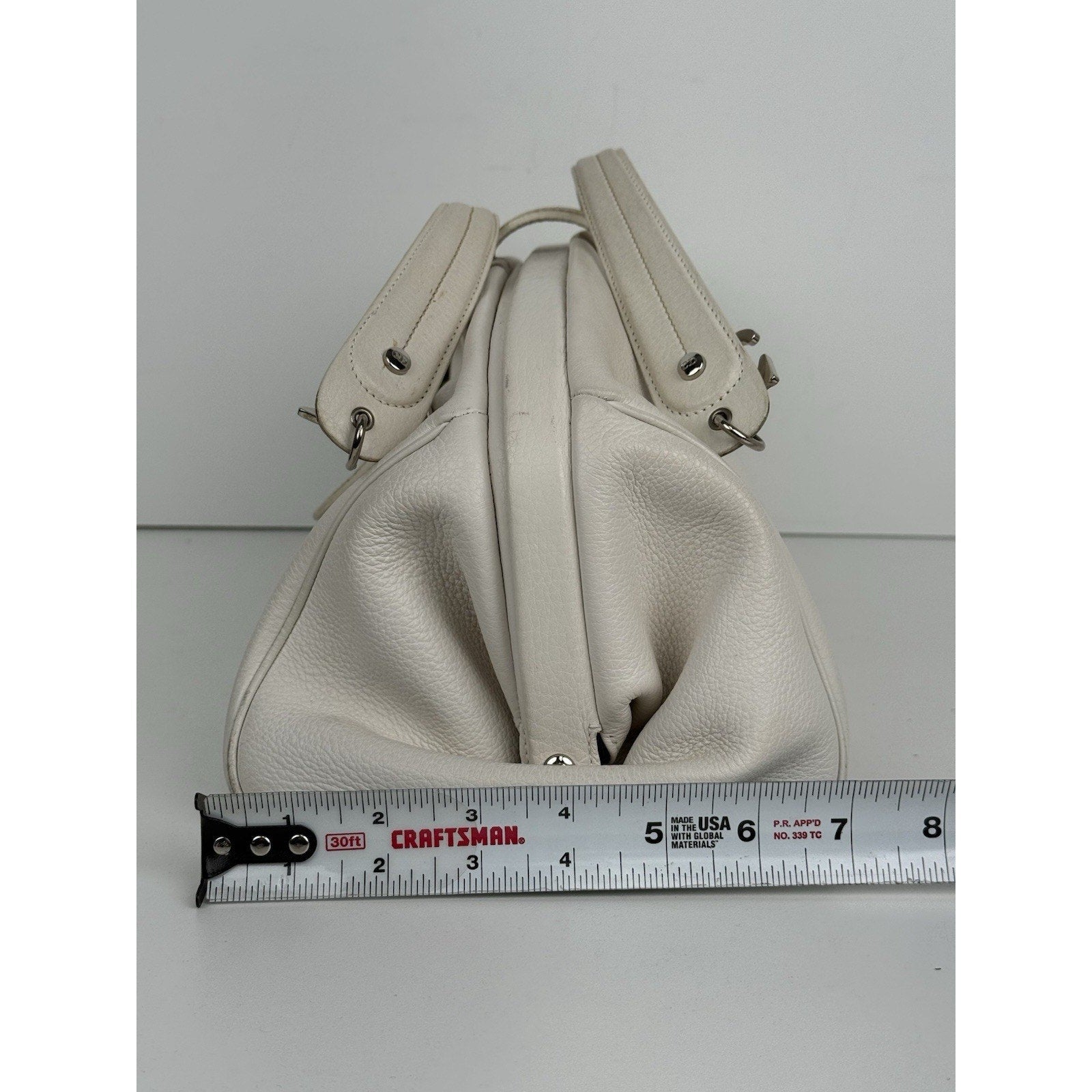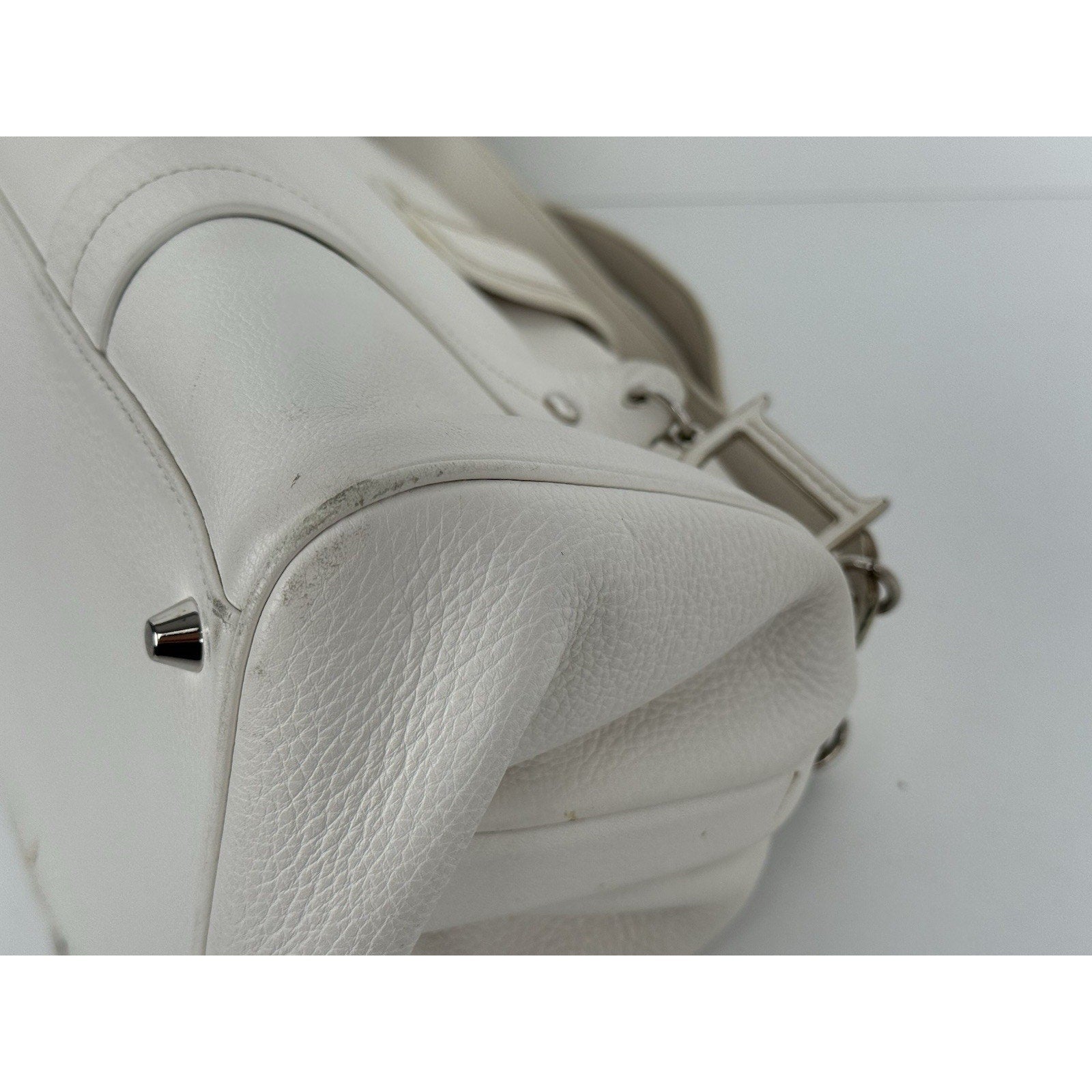 • Exterior condition: White leather exterior shows some darkened spots with barely visible scratches, scuffs, or stains. Hardware retains its silver shine.