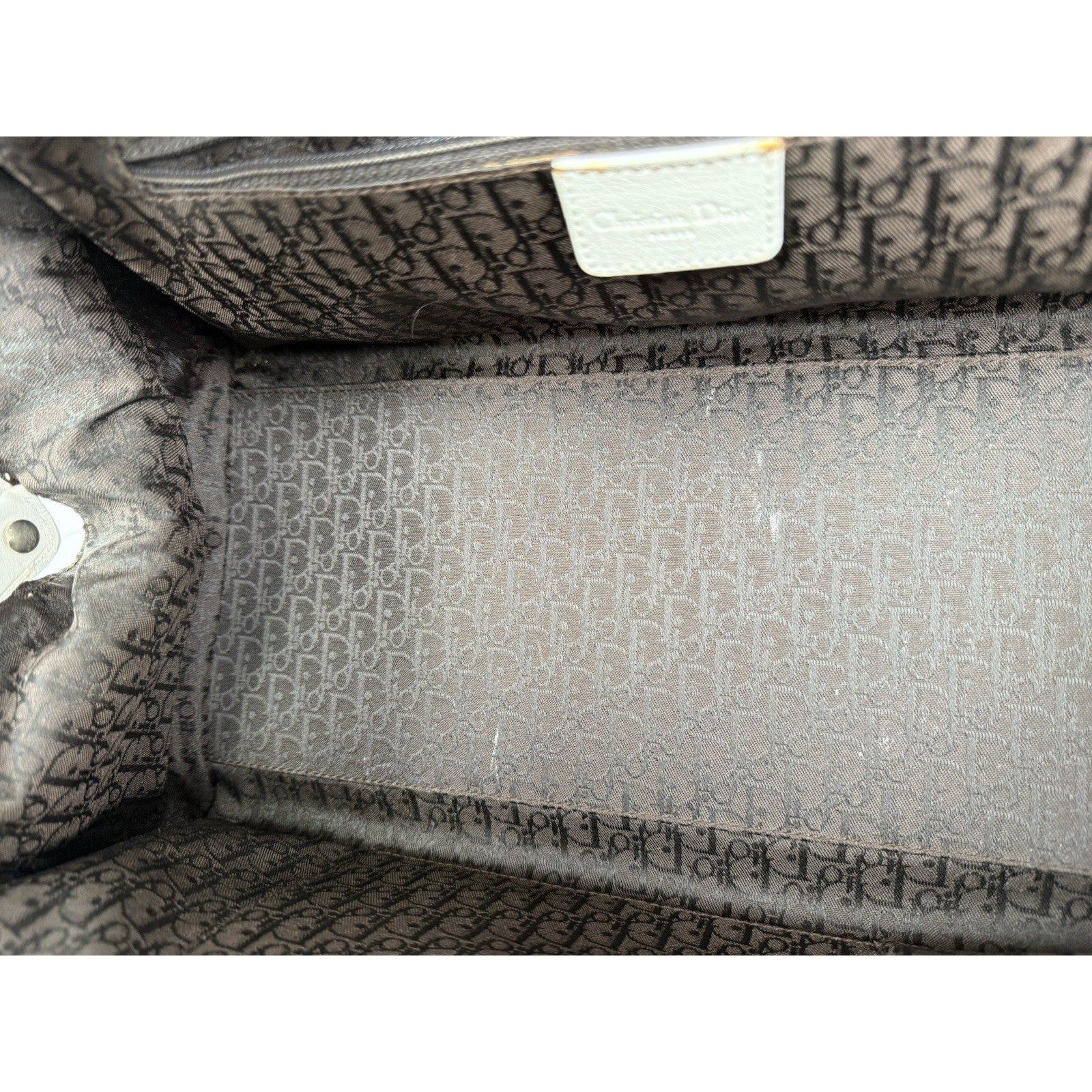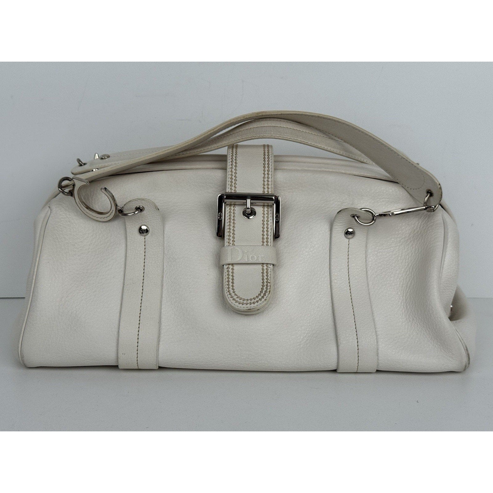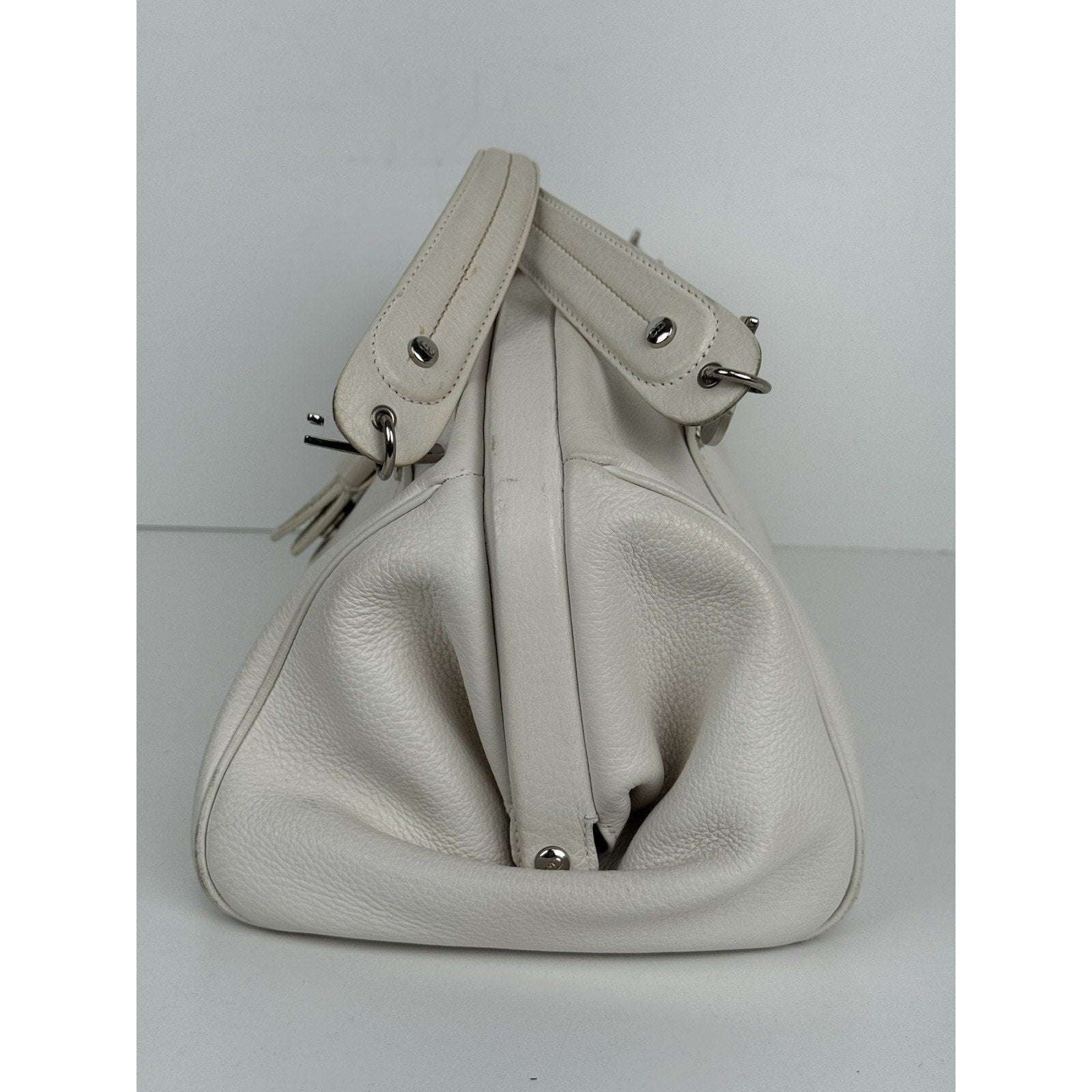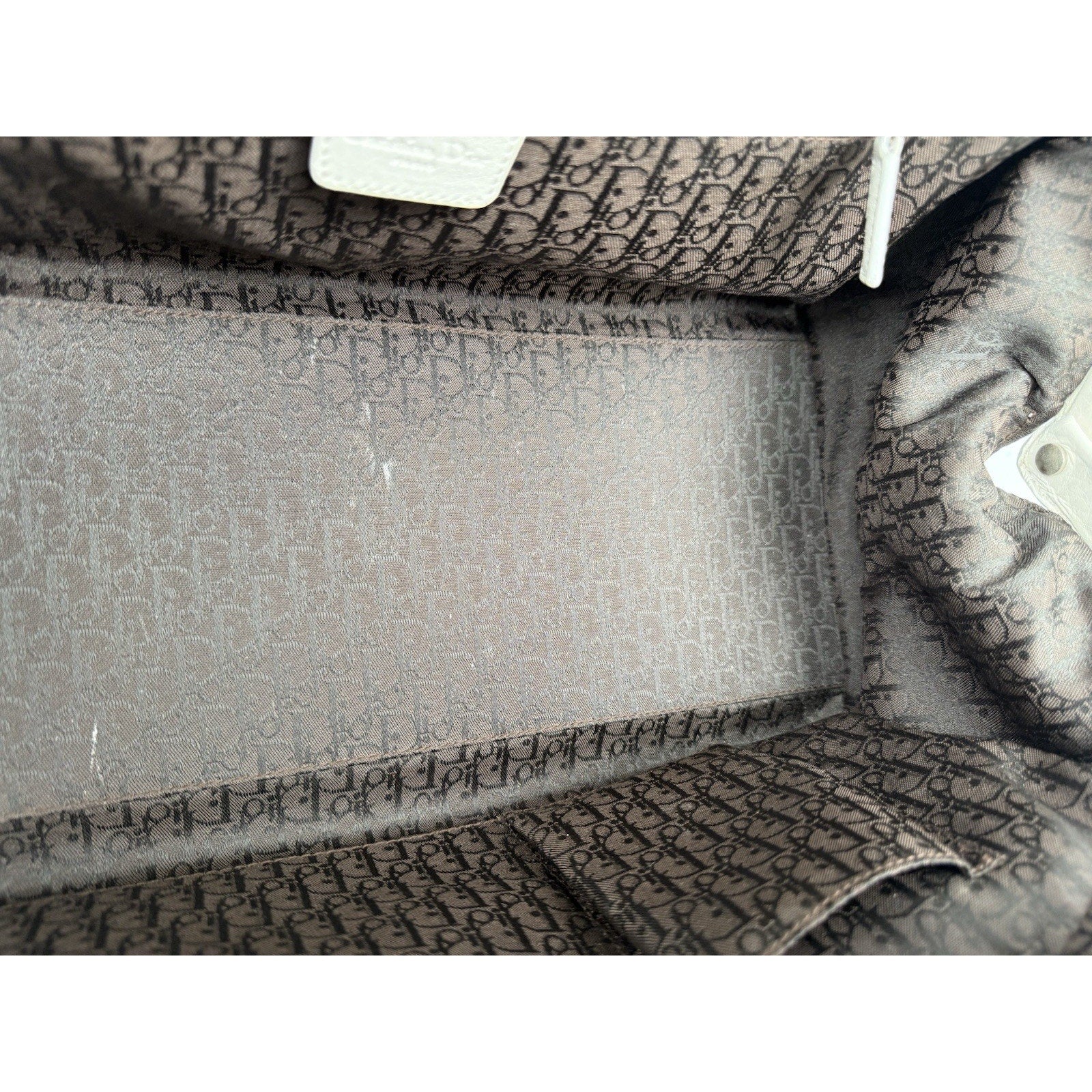 • Exterior condition: White leather exterior shows some darkened spots with barely visible scratches, scuffs, or stains. Hardware retains its silver shine.