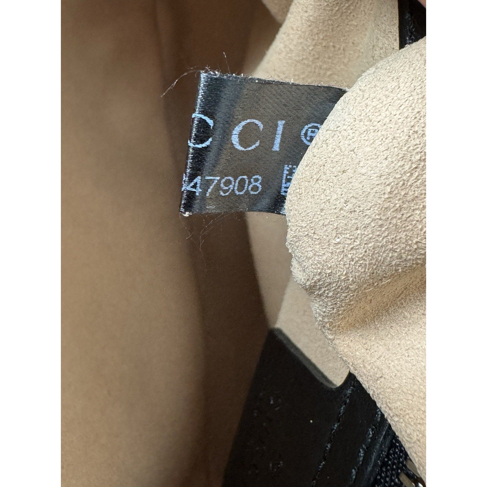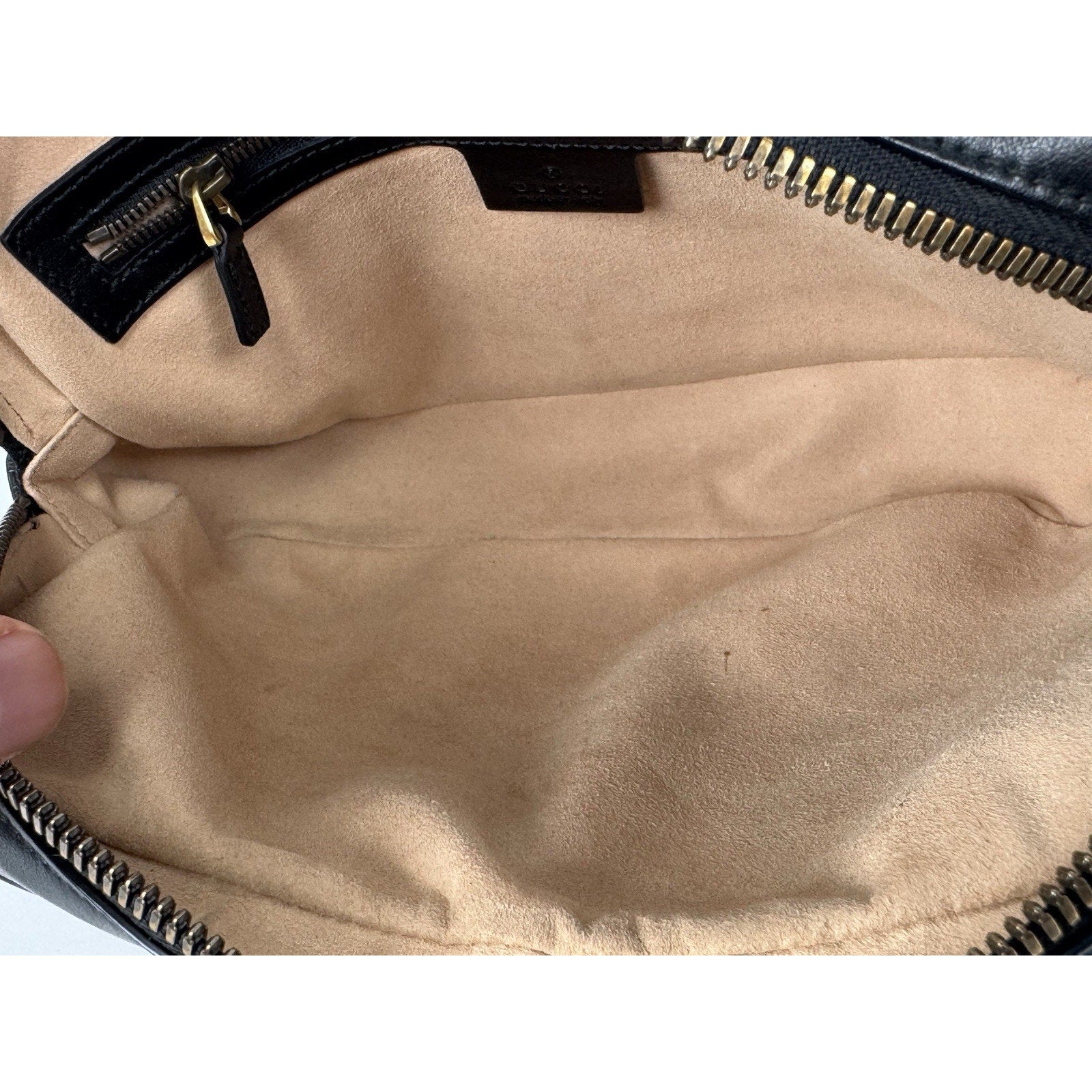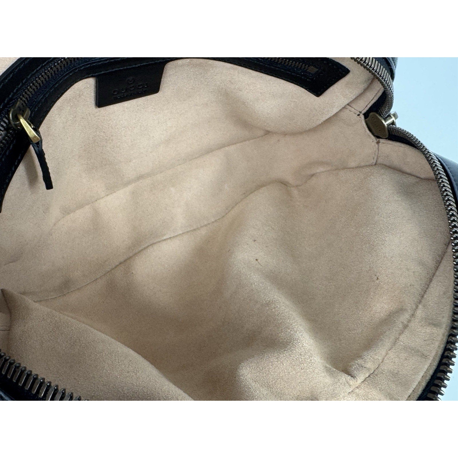 The interior is lined in beige suede and is clean with no visible stains. It shows a gentle sense of use but remains in very good condition.