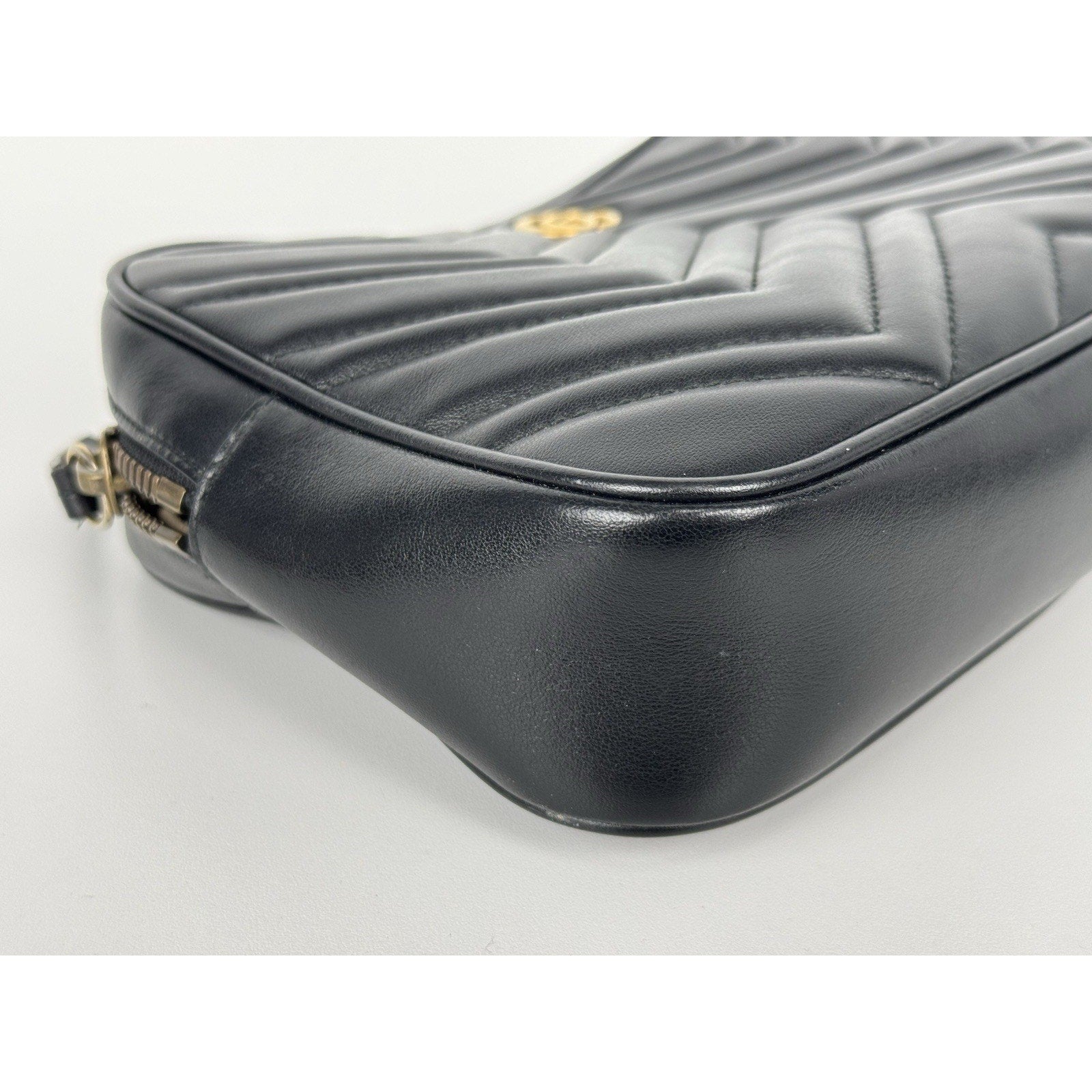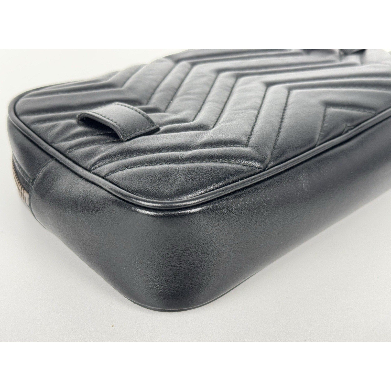 The black matelassé calfskin exterior is overall well maintained with no major flaws. There are some minor scuffs around the edges and light scratches visible on close inspection, consistent with gentle use. The belt is in good condition with only slight scratches on the hardware. The bag retains its shape and polished appearance.