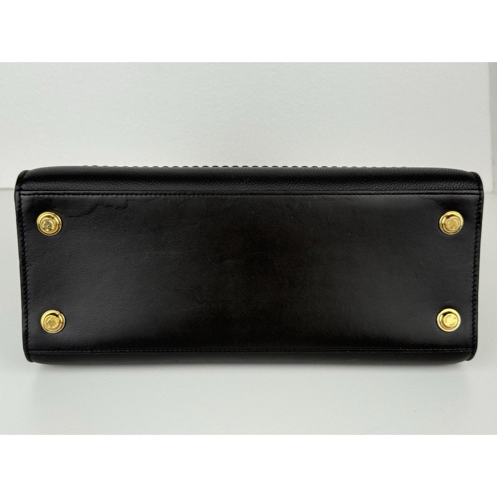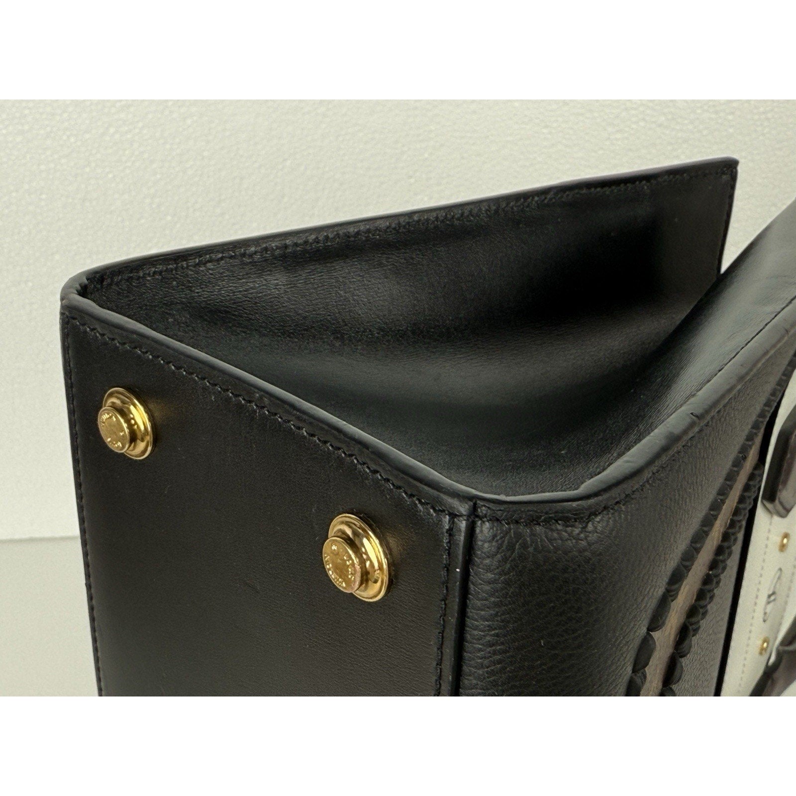 Made from a combination of canvas and leather, this trapezoid-shaped bag features a classic monogram pattern in black and white. It comes with double white handles, gold hardware, and a zip and turn lock closure for security. The interior is lined with leather and offers ample space with dimensions of 12 inches in width, 11 inches in height, and 5.5 inches in depth. Perfect for everyday use or special occasions, this shoulder bag exudes sophistication and elegance.