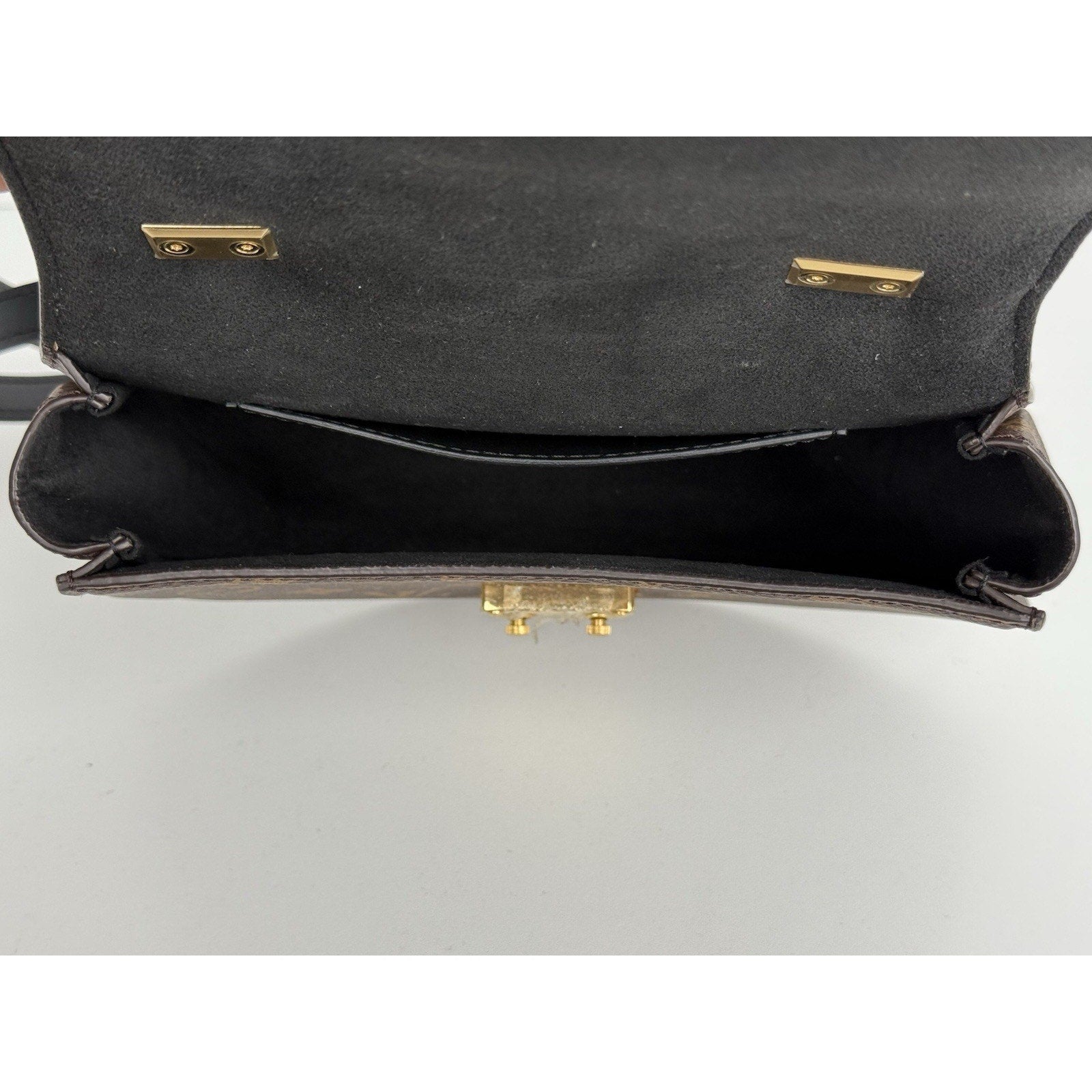 This Louis Vuitton Tilsit Shoulder Bag is crafted from Monogram Reverse coated canvas with black leather trim and accented by gold-tone hardware. The bag features a structured silhouette, top handle, and an adjustable strap for versatile carry. Its S-lock closure adds a classic Louis Vuitton touch, while the black microfiber interior provides a refined finish.