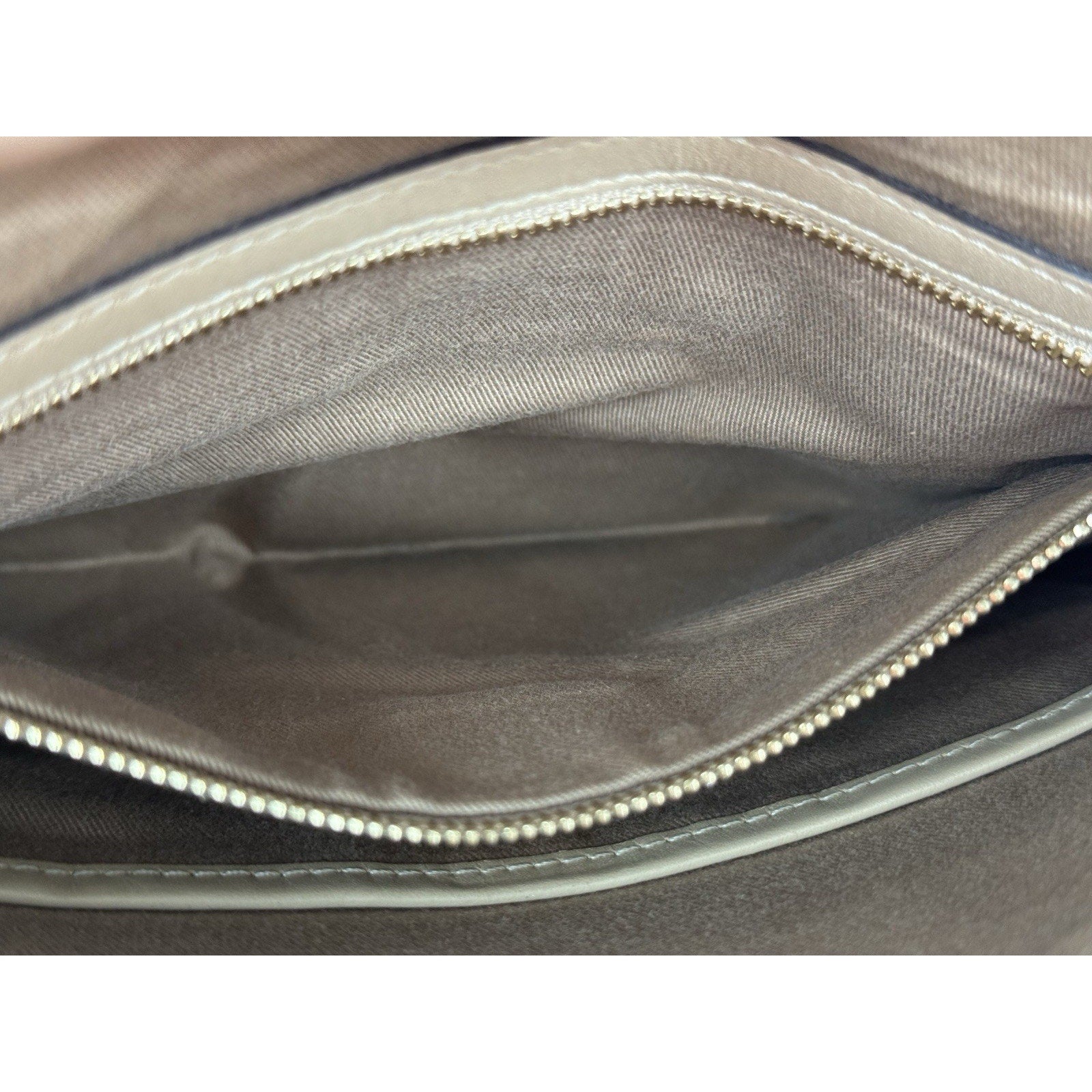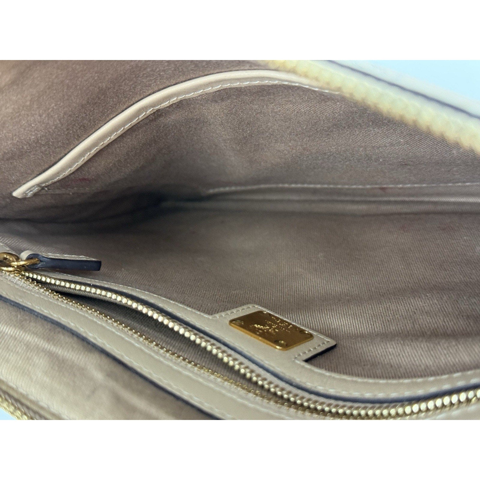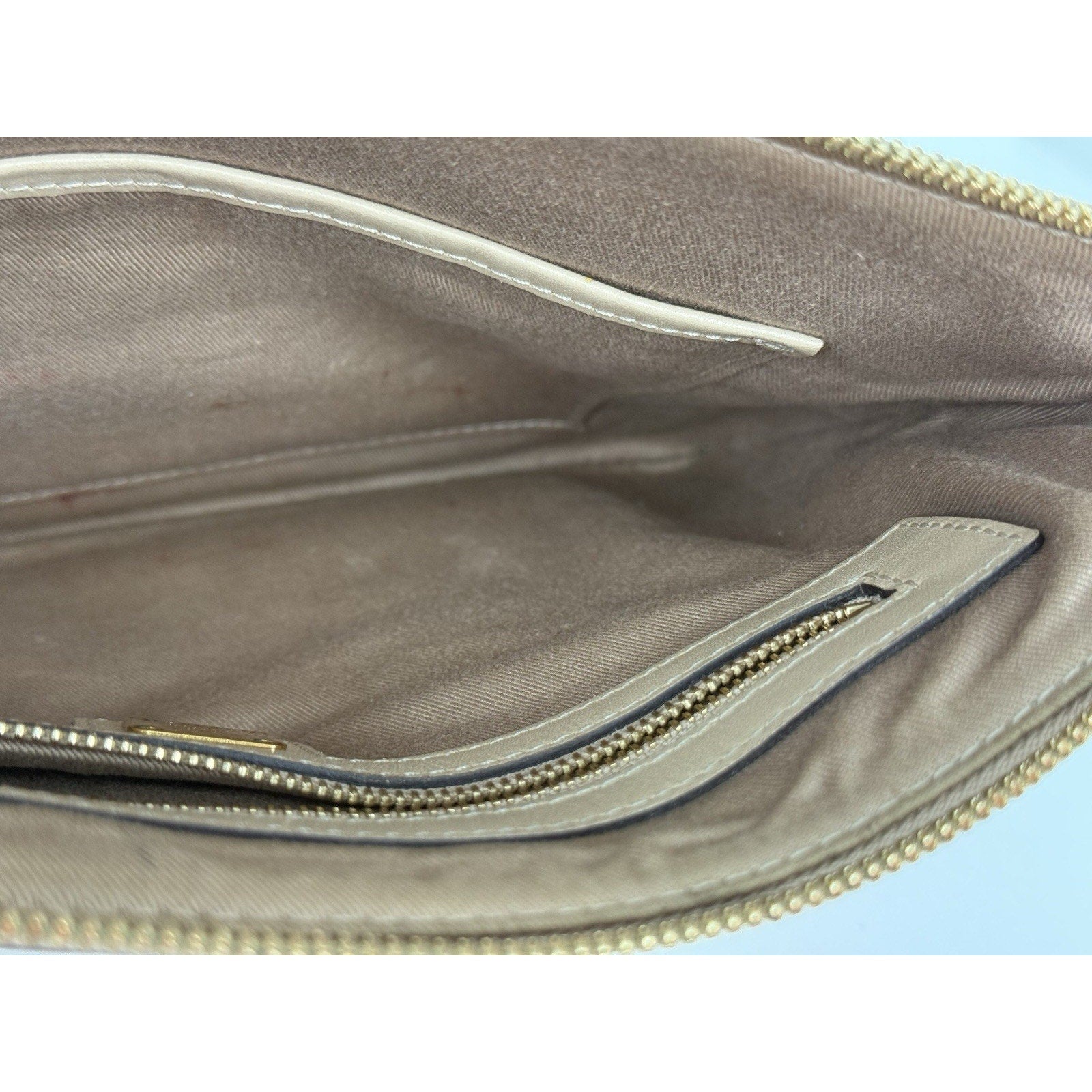 The bag comes with a beige leather crossbody strap and gold-tone hardware, making it versatile for everyday use. The interior is fully lined in beige for a coordinated look.