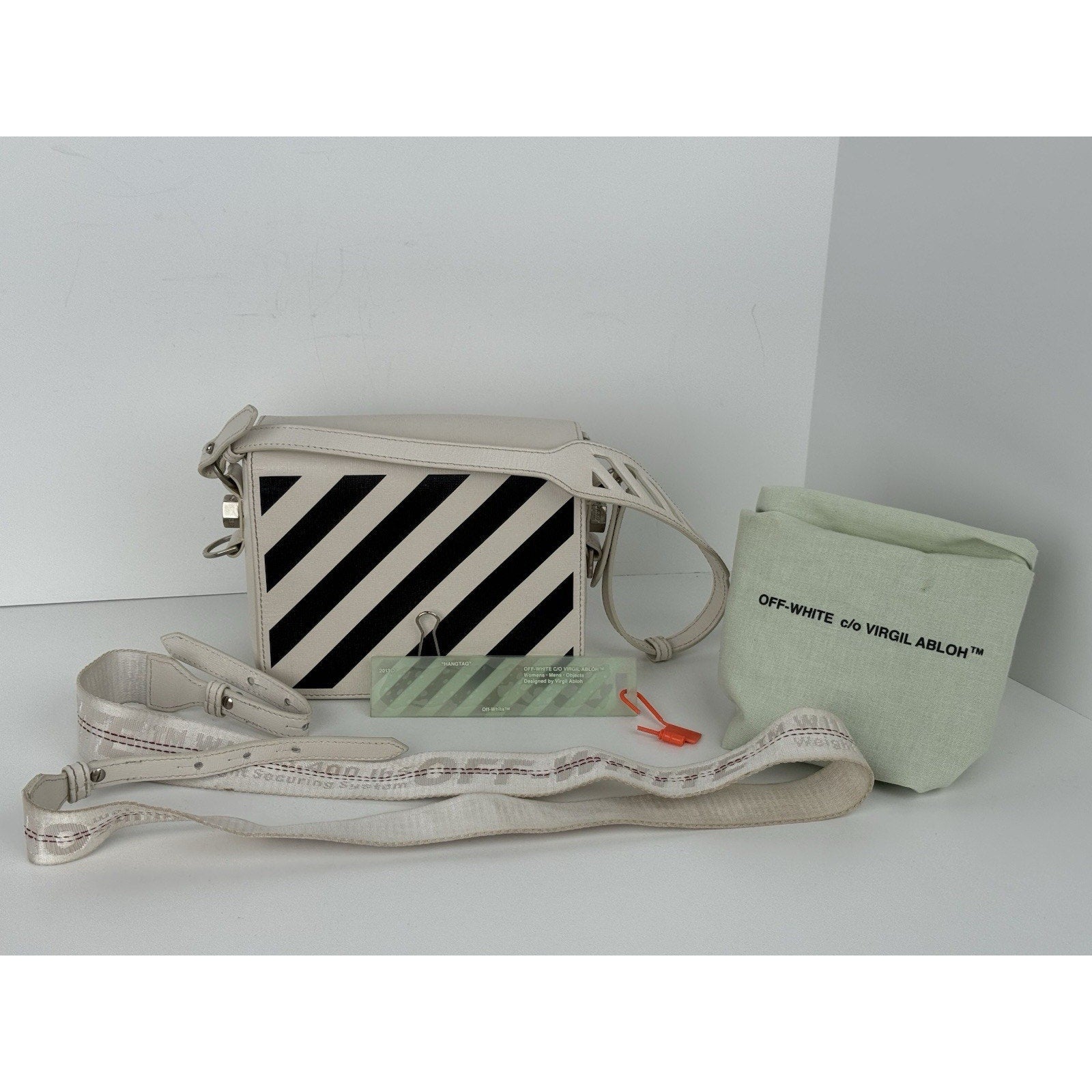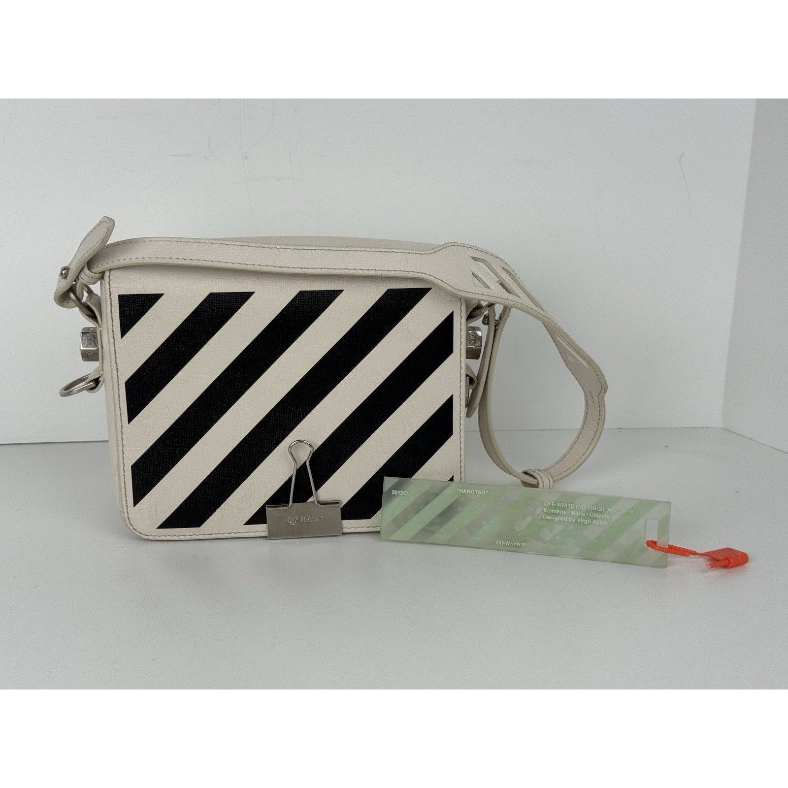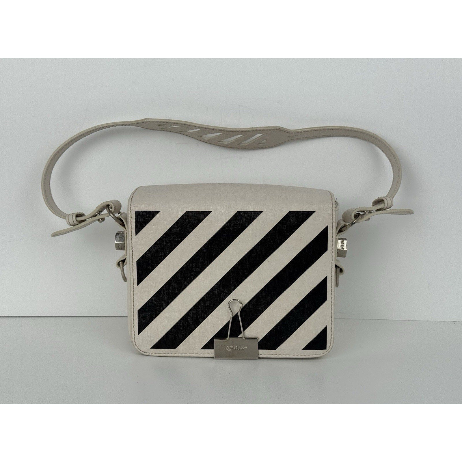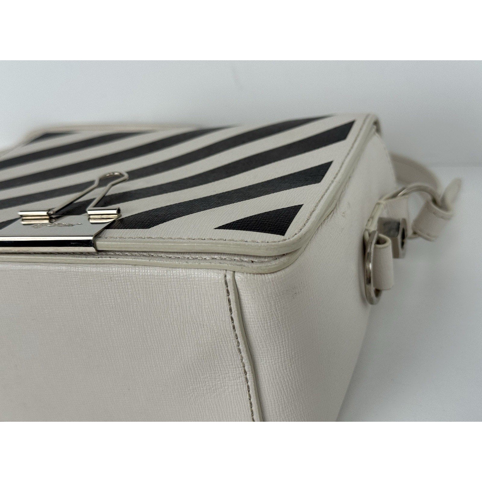 Off-White Diagonal Stripe Binder Clip Shoulder Bag White Leather with Silver