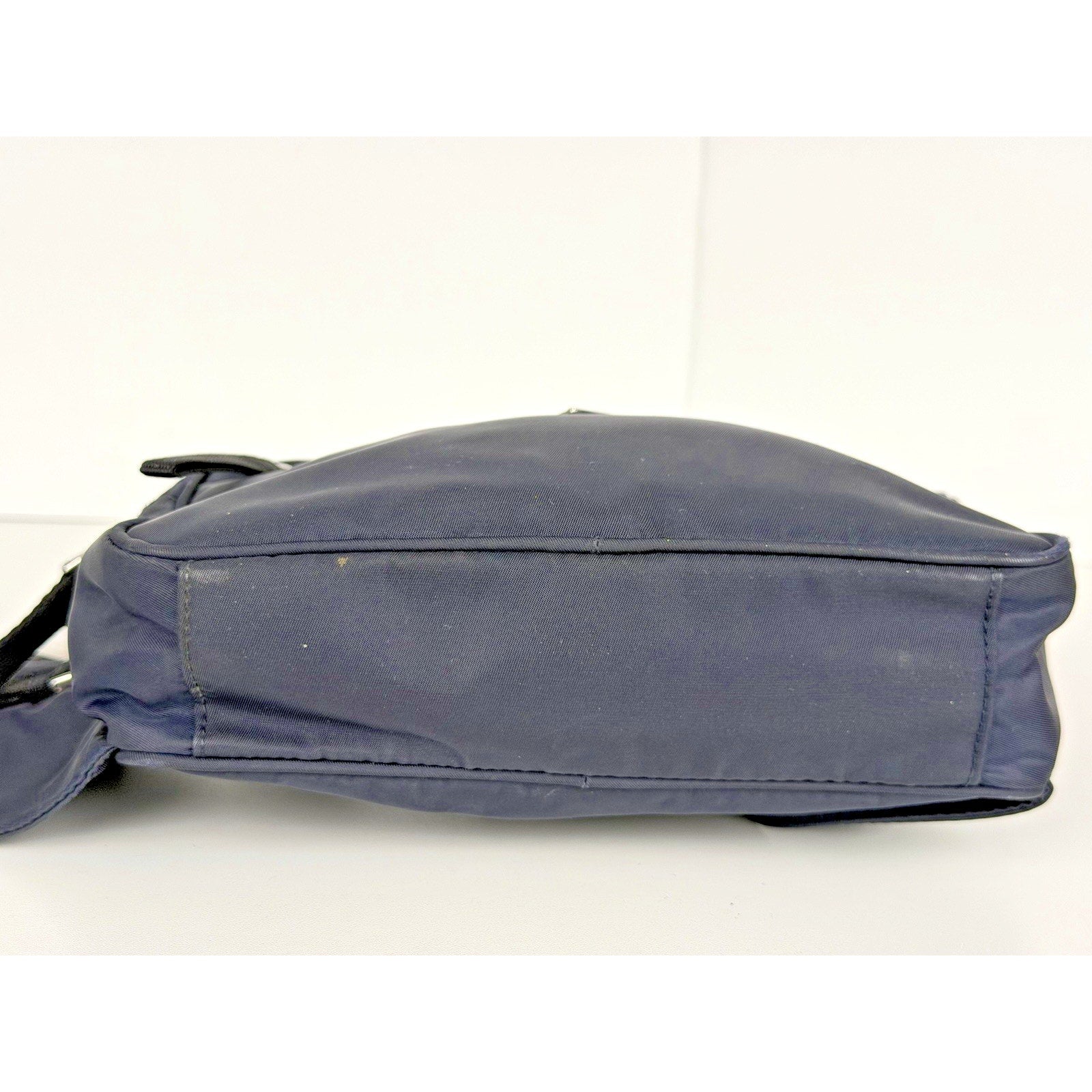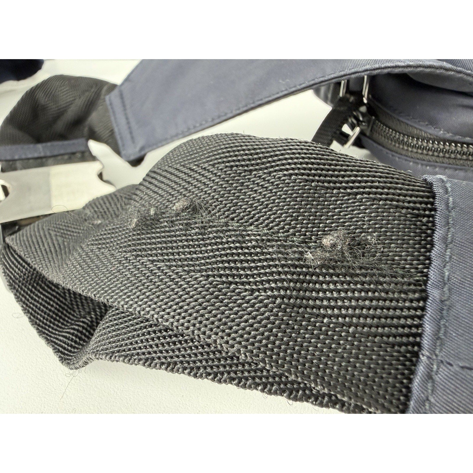 Exterior Condition: The nylon exterior shows visible signs of prior use but remains fully functional. There are some tiny stains present on the outside that are noticeable upon closer inspection. The overall structure is intact, and the bag maintains its shape. Hardware shows discoloration consistent with regular use, while the zippers function smoothly.
