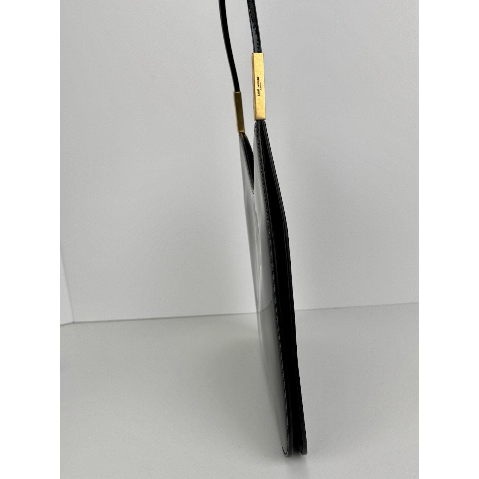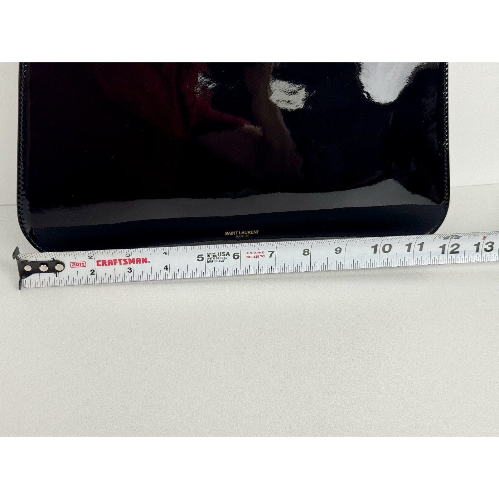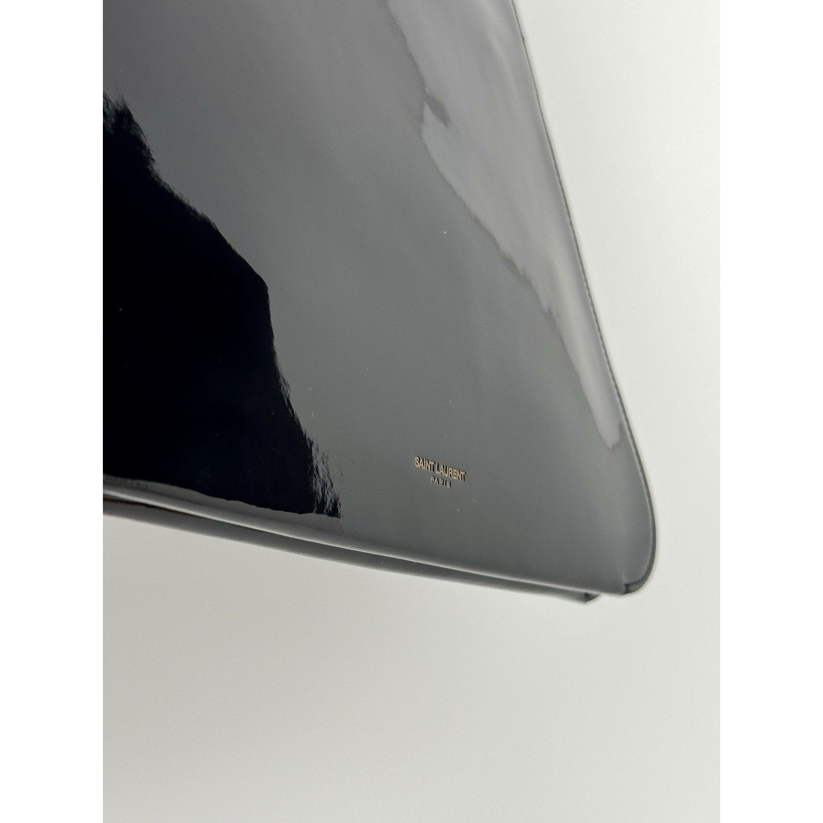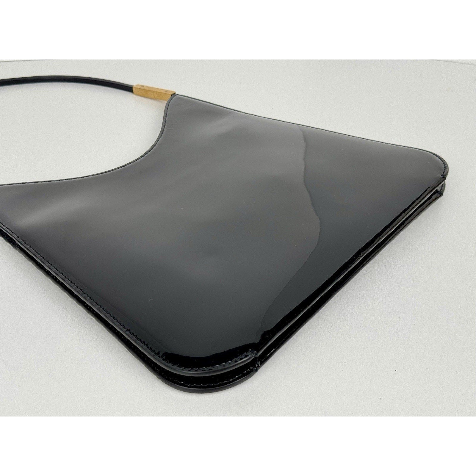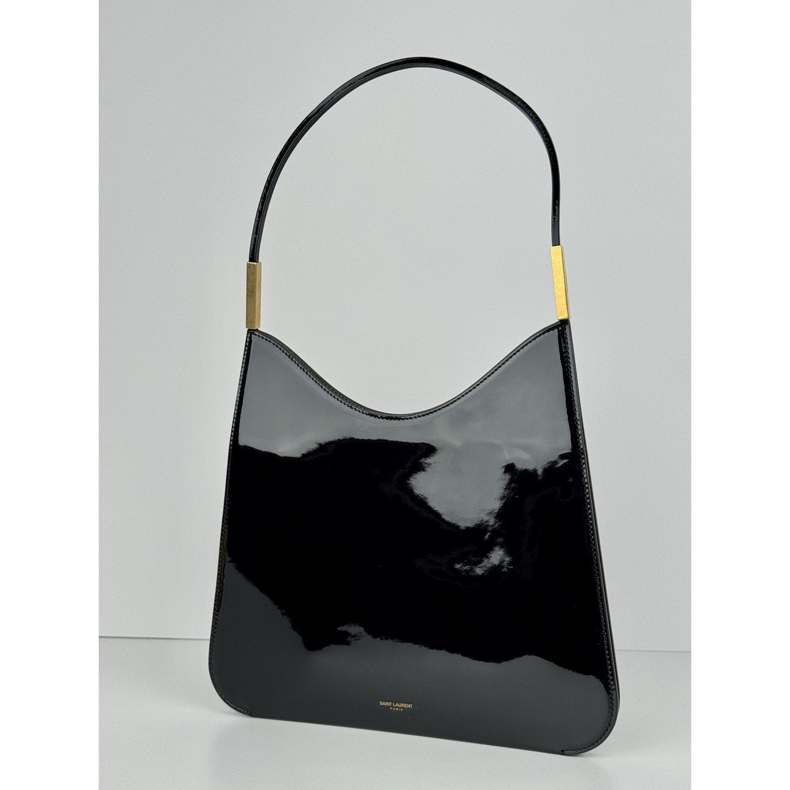 The Saint Laurent Sadie Hobo Bag in patent leather is a stylish and luxurious handbag designed for women. With a sleek black exterior and matching black patent leather handles/straps, this hobo bag exudes elegance and sophistication. The solid pattern and classic hobo bag style make it a versatile accessory that can elevate any outfit. Crafted from high-quality patent leather, this bag is both durable and chic, perfect for any fashion-forward woman looking to make a statement.